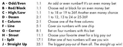 Tier: Also known as ‘Tiers du Cylindre’, this bet covers the third of the wheel roughly opposite the zero. 12 numbers are covered, with just six unit stakes. Any winning bet will pay the player three times their initial stake.
